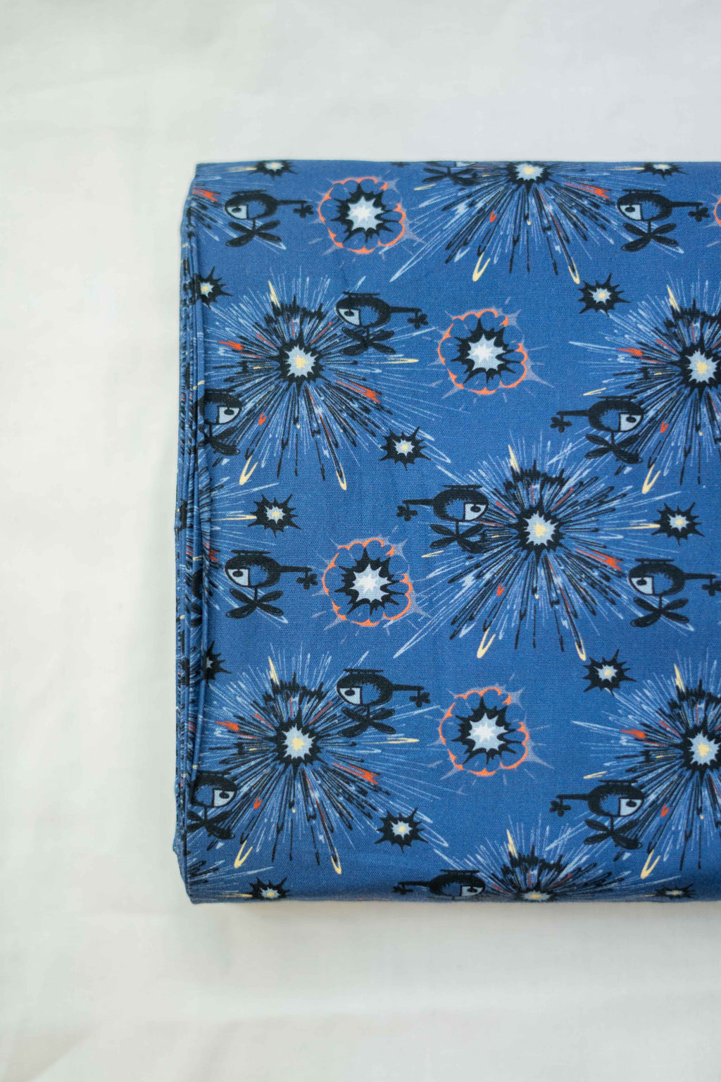Baumwollstoff Hubschrauber und Explusionen auf blau